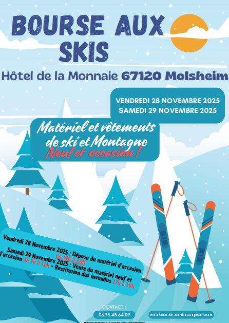 Molsheim Ski Nordique organisera sa 32ème bourse aux skis les vendredi 28 et samedi 29 novembre 2025 à l'hôtel de la Monnaie, place de la Monnaie à Molsheim.